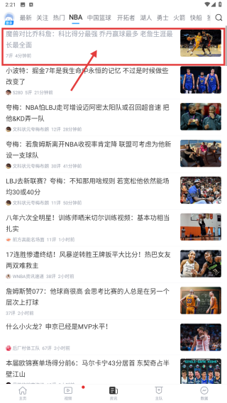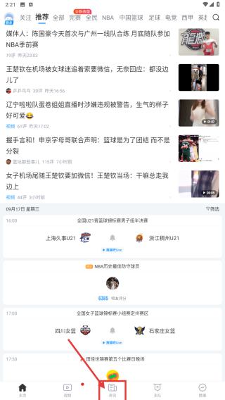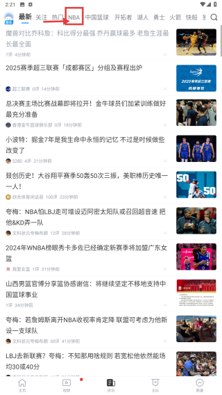 1、打開體育類資訊應用,點擊底部資訊分類標簽,進入NBA資訊列表頁。