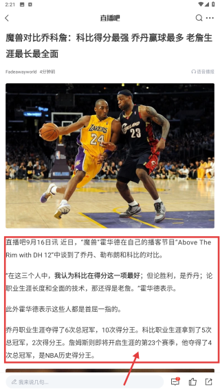 4、在詳情頁中,能查看霍華德對喬丹、科比、詹姆斯在得分、贏球、生涯長度等方面對比的詳細文字內容。