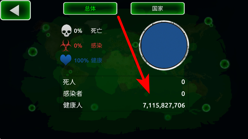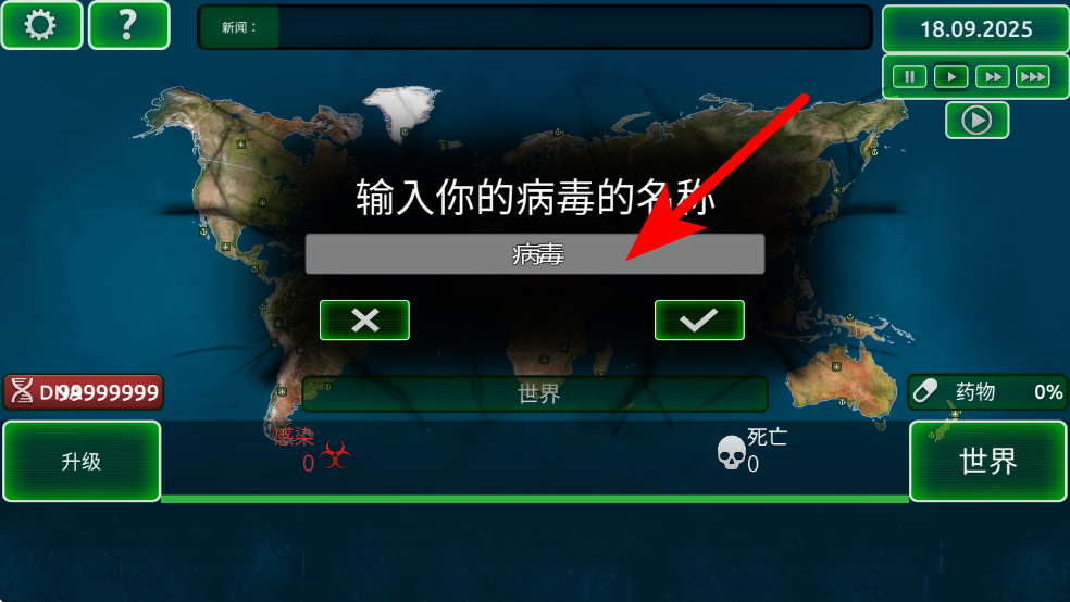 1、開局時,需為病毒命名,確定名稱后進入游戲,此時全球人口健康,感染和死亡數(shù)均為0,要開始病毒的傳播進程。