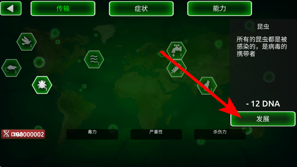 2、在傳輸?shù)冉缑?,可消耗DNA點數(shù)來發(fā)展病毒的傳播能力,比如讓昆蟲成為病毒攜帶者,助力病毒更廣泛地傳播。