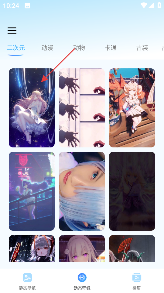 2、在動態(tài)壁紙頁面,選擇二次元分類,并點擊喜歡的壁紙,進入壁紙詳情頁。
