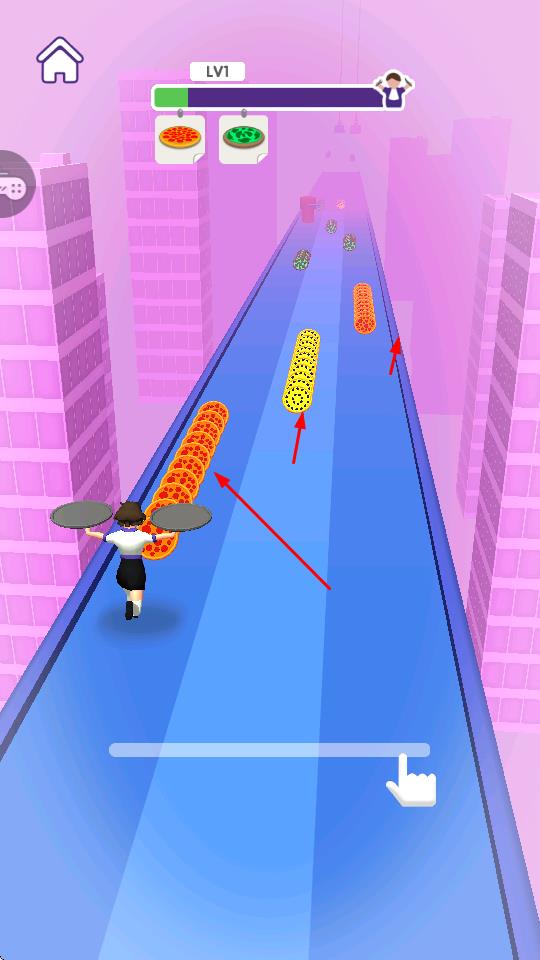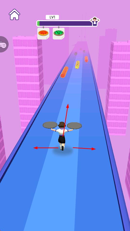 1、操控角色在藍(lán)色通道上移動(dòng),收集不同種類的披薩,這是推進(jìn)關(guān)卡的基礎(chǔ)操作,為后續(xù)送餐進(jìn)程奠定基礎(chǔ)。