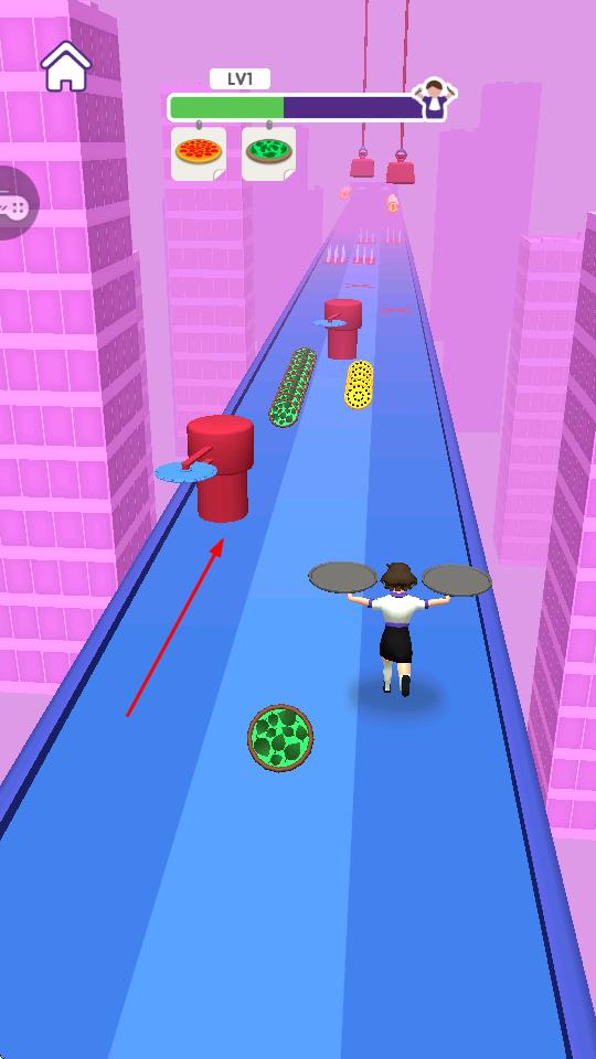3、遇到旋轉(zhuǎn)的紅色圓柱等機(jī)關(guān)時(shí),靈活調(diào)整角色位置,避開(kāi)機(jī)關(guān)干擾,同時(shí)收集綠色披薩,維持送餐進(jìn)度。