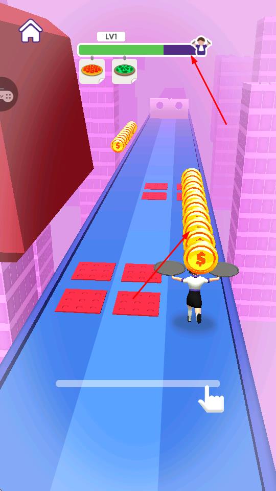 4、游戲過(guò)程中,收集金幣可提升進(jìn)度條,朝著關(guān)卡目標(biāo)推進(jìn),順利完成送餐跑酷挑戰(zhàn)。
