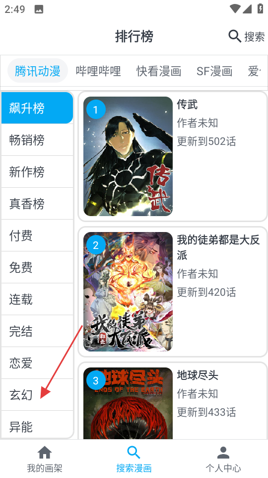 2、在排行榜頁面,點(diǎn)擊左側(cè)的玄幻分類,查看玄幻類漫畫排行。