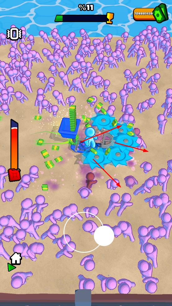 2、開啟武器收割僵尸:面對靠近的僵尸及時開啟收割武器,利用武器的范圍攻擊快速碾壓清除,結(jié)合移動調(diào)整收割范圍,高效處理密集的僵尸群體,提升闖關(guān)效率。
