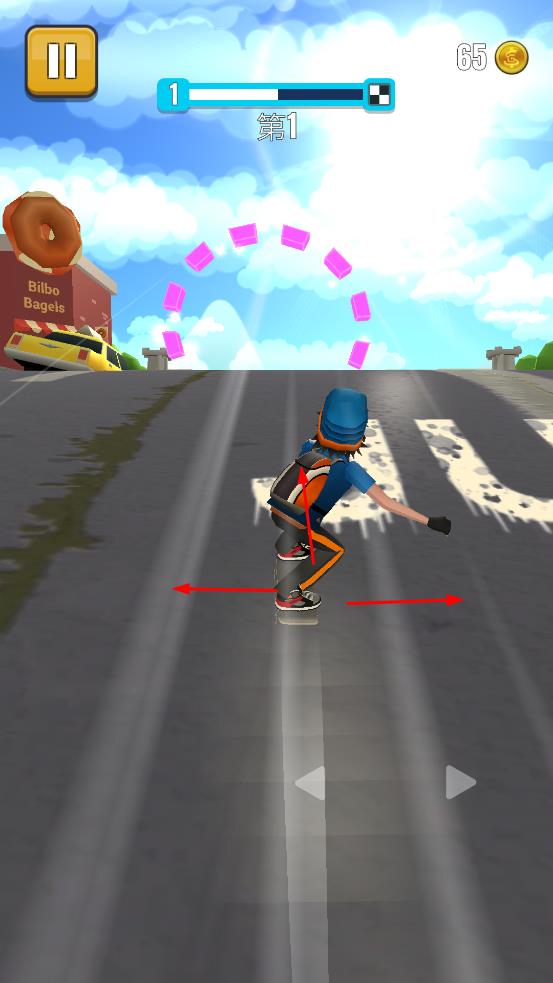 1、點擊開始游戲,操控滑板角色在道路上左右移動,靈活躲避障礙,朝著目標方向前進。
