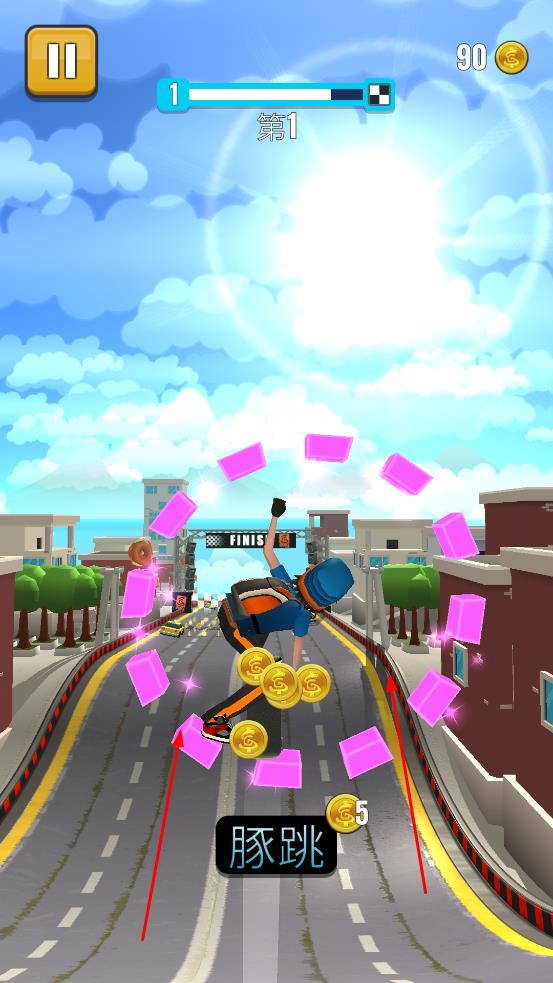 2、行駛過程中,可觸發(fā)豚跳等動作,收集粉色道具與金幣,積累資源的同時提升游戲表現(xiàn)。
