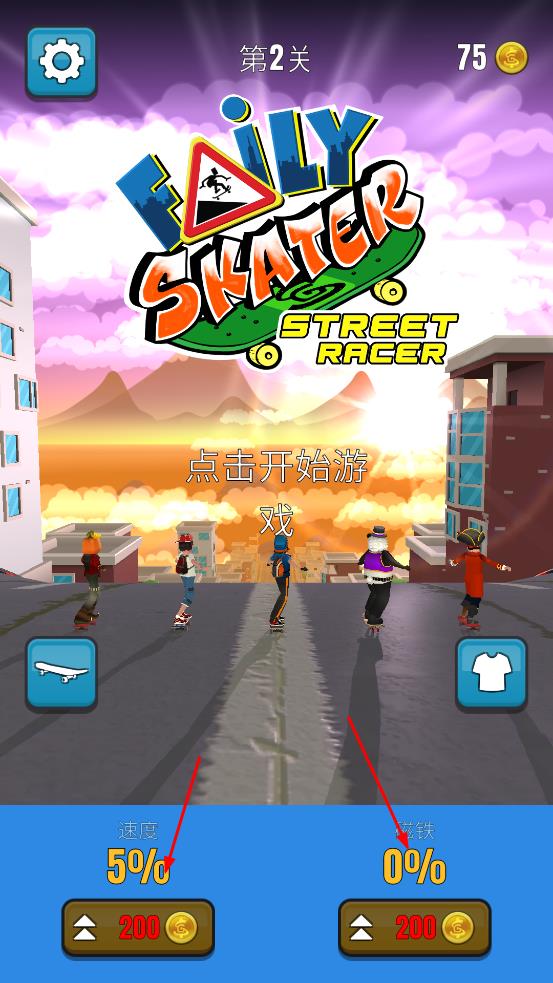 4、在關卡選擇界面,可消耗金幣升級速度等屬性,優(yōu)化滑板性能,為后續(xù)競速提供助力。