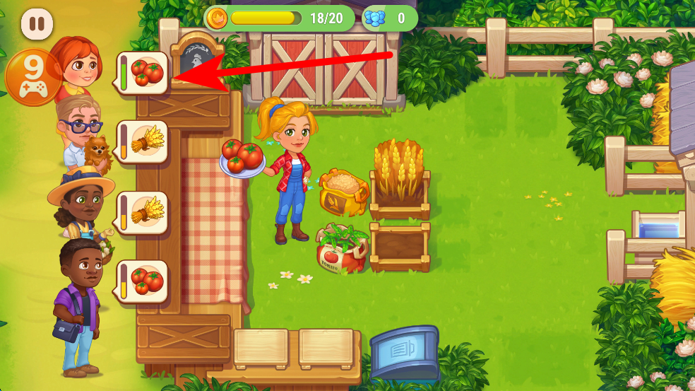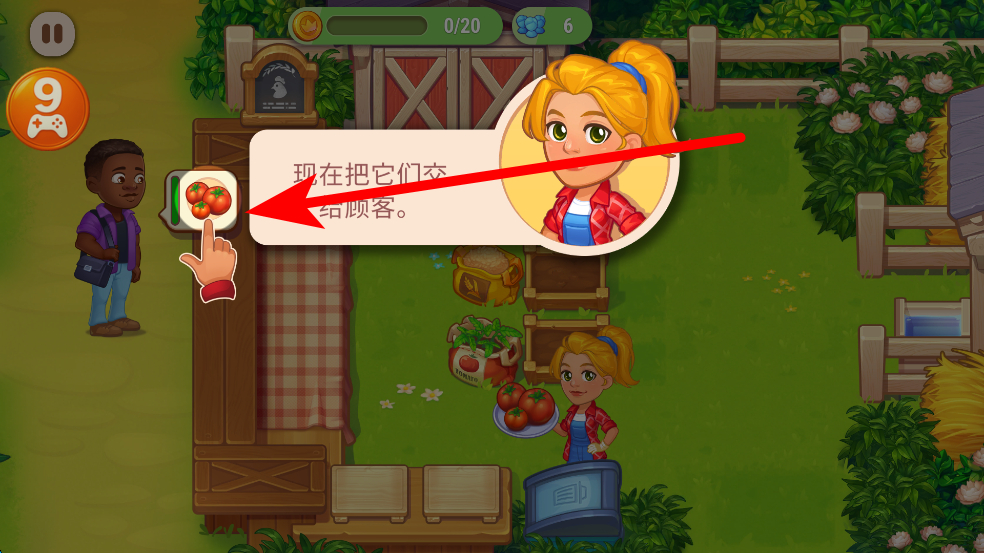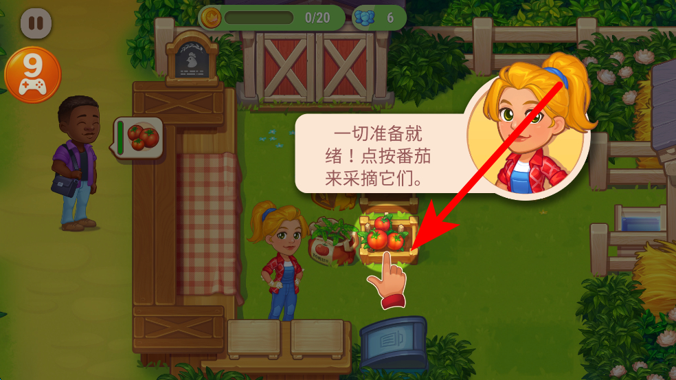 1、進(jìn)入關(guān)卡后,按照提示,點(diǎn)按成熟的作物,比如番茄,完成采摘操作,采摘后的作物會準(zhǔn)備好用于后續(xù)步驟。