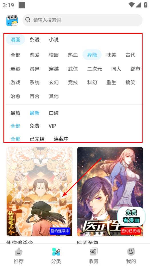 2、在分類頁面,篩選好條件后,點擊仙道追殺令,進入該漫畫詳情頁。