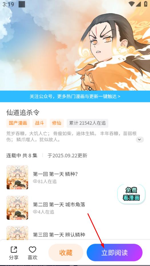 3、在仙道追殺令詳情頁,點擊立即閱讀,進入閱讀界面。