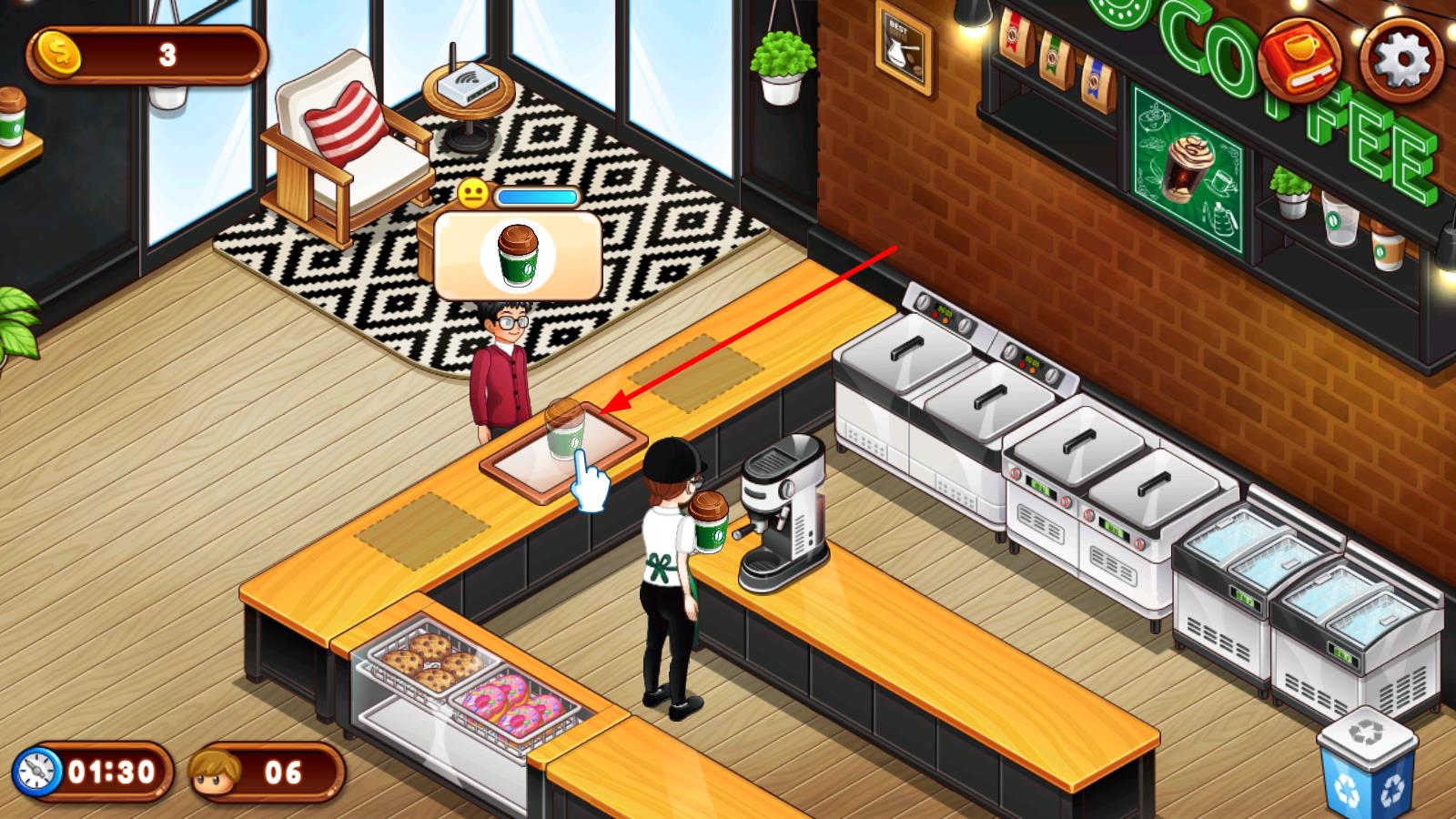 4、咖啡制作完成后,點(diǎn)擊制作好的咖啡,將其遞送給對應(yīng)的顧客,完成此次服務(wù)流程。