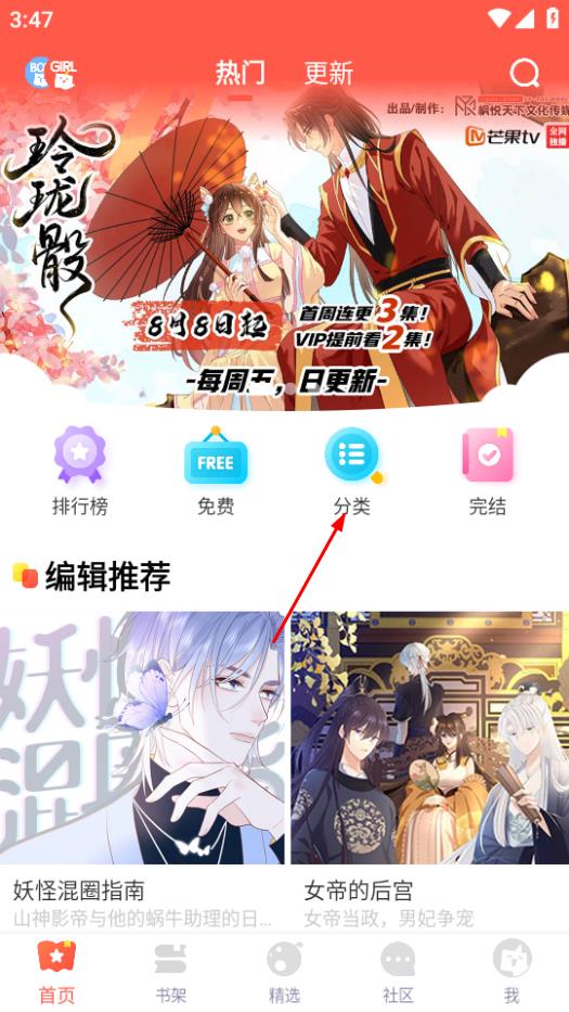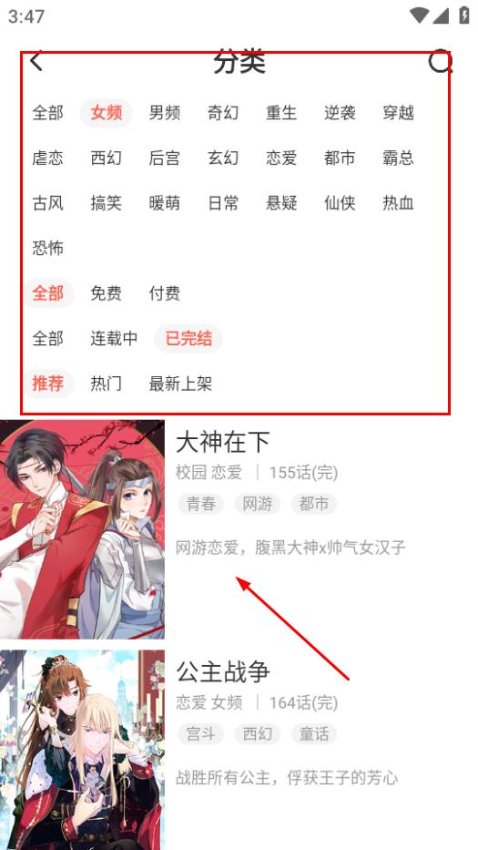 2、在分類頁面,篩選好條件后,點(diǎn)擊大神在下,進(jìn)入該漫畫詳情頁。
