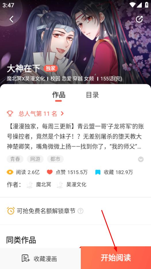 3、在大神在下詳情頁,點(diǎn)擊開始閱讀,進(jìn)入閱讀界面。