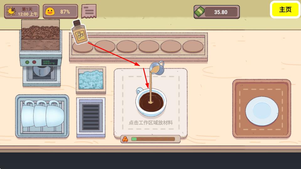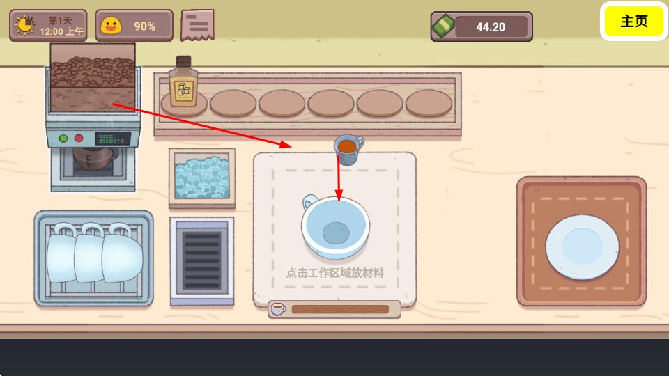 1、進(jìn)入咖啡制作界面,在工作區(qū)域添加咖啡原料,開啟咖啡制作流程,為顧客準(zhǔn)備飲品。
