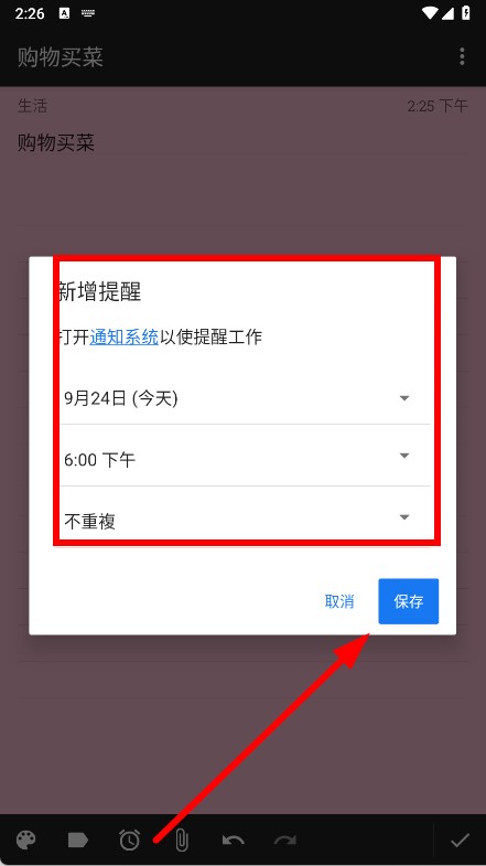 3、點(diǎn)擊底部的鬧鐘圖標(biāo),設(shè)置提醒時間,點(diǎn)擊保存。
