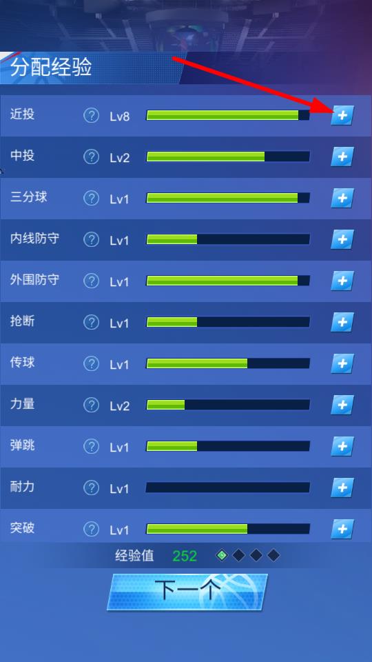 4、在分配經(jīng)驗界面,點擊近投右側的+按鍵,可將經(jīng)驗分配給近投屬性,提升球員近投能力。