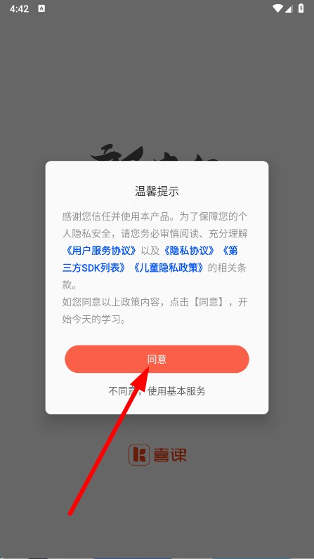1、打開喜課新概念英語,在溫馨提示彈窗中點(diǎn)擊同意。