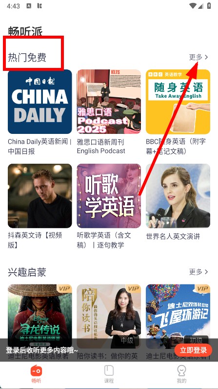 2、進(jìn)入APP后,找到暢聽派板塊下的熱門免費(fèi),點(diǎn)擊其右側(cè)的更多。