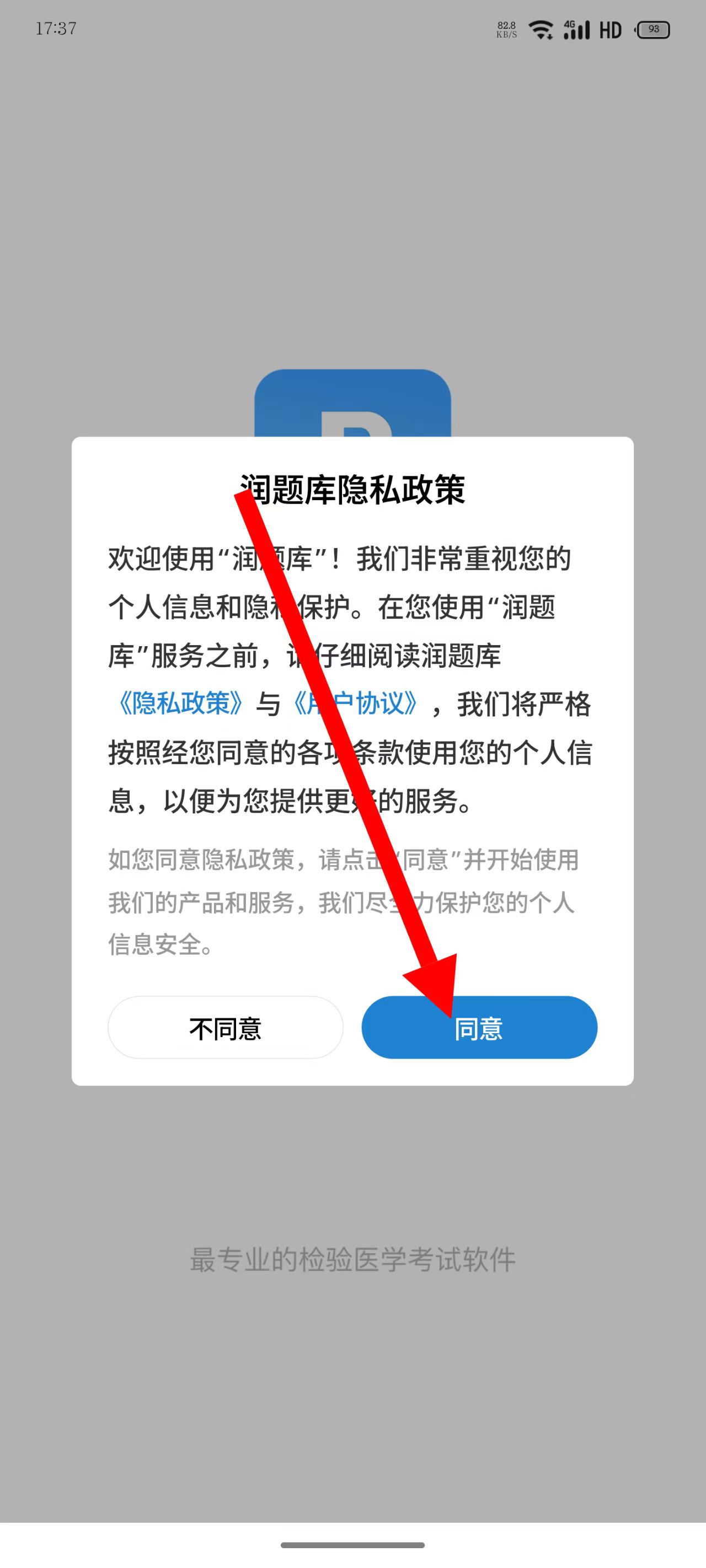 1、打開潤題庫APP,在潤題庫隱私政策彈窗中點擊同意。