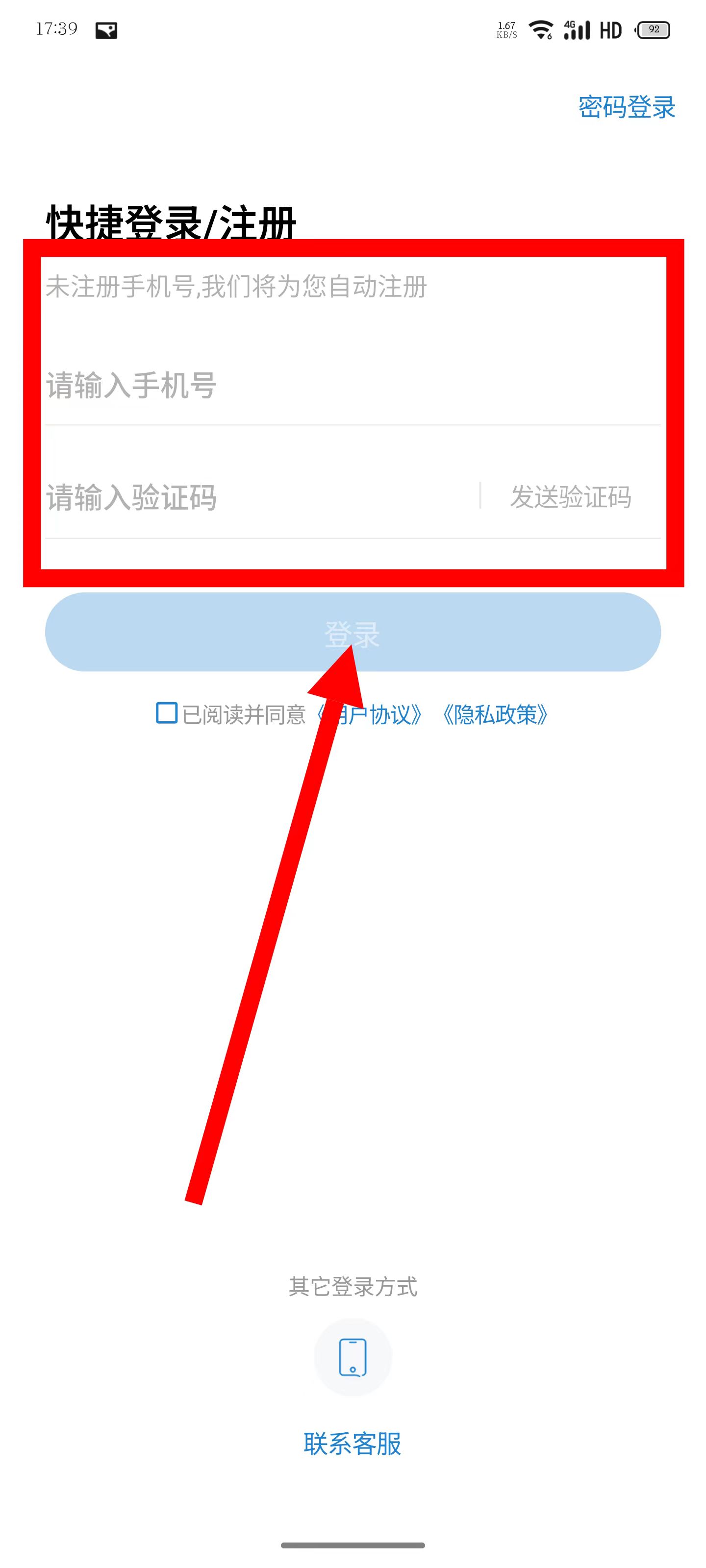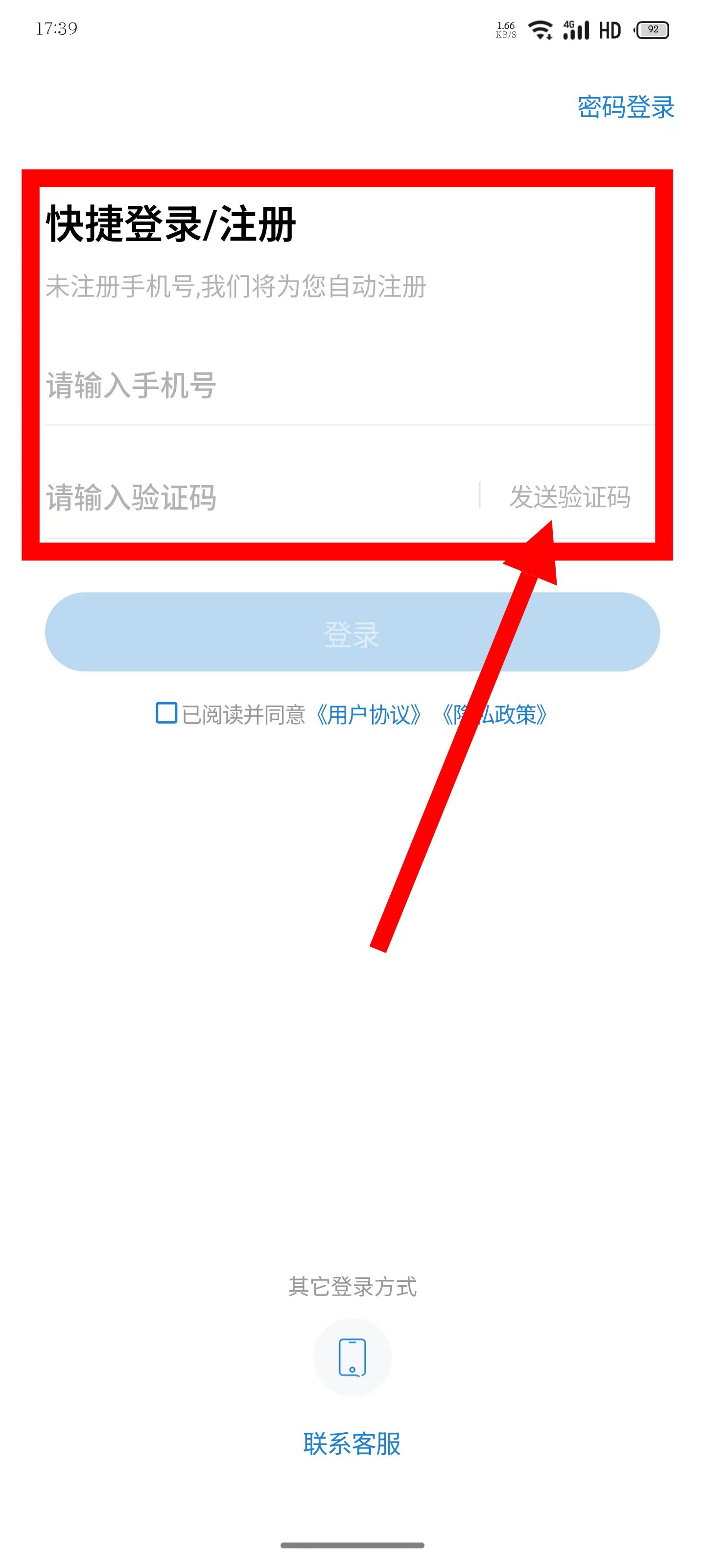 3、在快捷登錄注冊頁面,輸入手機號,點擊發(fā)送驗證碼。