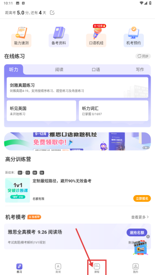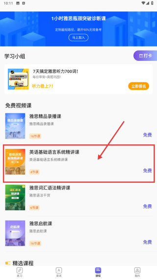 1、打開(kāi)雅思學(xué)習(xí)APP,點(diǎn)擊底部課程選項(xiàng),進(jìn)入課程推薦頁(yè)面。