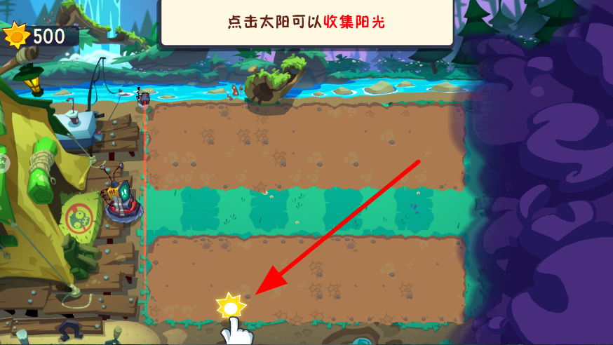1、進入游戲后,點擊場景中的太陽,收集陽光,陽光是種植植物的重要資源,通過持續(xù)收集,為后續(xù)種植植物做好資源儲備。