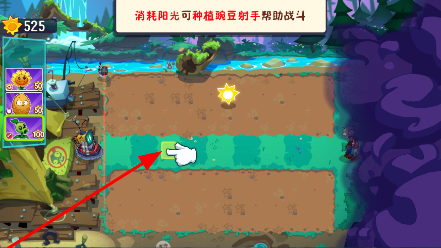 2、當擁有足夠陽光后,消耗陽光種植豌豆射手等植物,將植物種在合適的位置,讓其能夠有效攻擊前來的僵尸,助力戰(zhàn)斗。