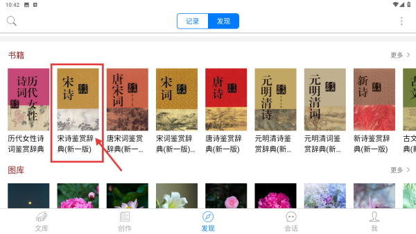 2、在發(fā)現(xiàn)板塊頁面,點擊宋詩鑒賞辭典新一版書籍條目,進(jìn)入書籍詳情頁。