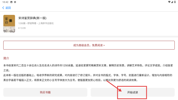 3、在書籍詳情頁,點擊開始試讀按鈕,進(jìn)入書籍閱讀頁。