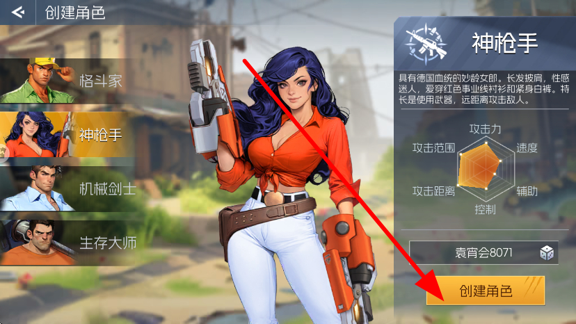 1、玩家開(kāi)始游戲,角色創(chuàng)建界面挑選喜歡的角色,如神槍手等,確定后點(diǎn)擊創(chuàng)建角色,正式踏入游戲世界,開(kāi)啟冒險(xiǎn)征程。