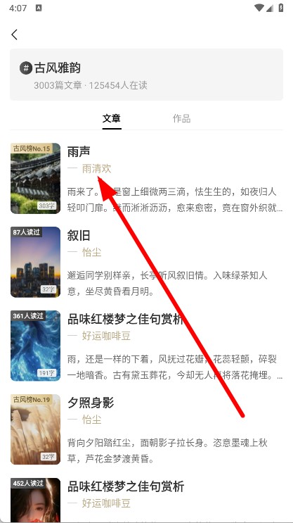 3、進(jìn)入古風(fēng)雅韻分類(lèi)頁(yè)面后,選擇一篇文章。