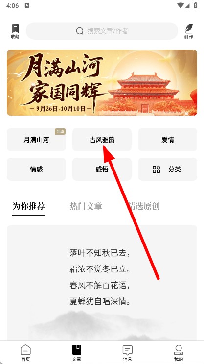 2、在文章頁(yè)面,點(diǎn)擊古風(fēng)雅韻分類(lèi)。