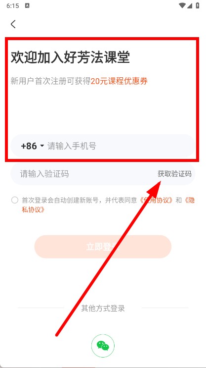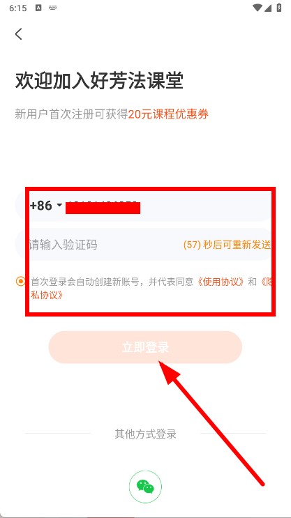4、輸入收到的驗證碼,勾選同意相關(guān)協(xié)議后,點(diǎn)擊立即登錄,即可完成注冊登錄。