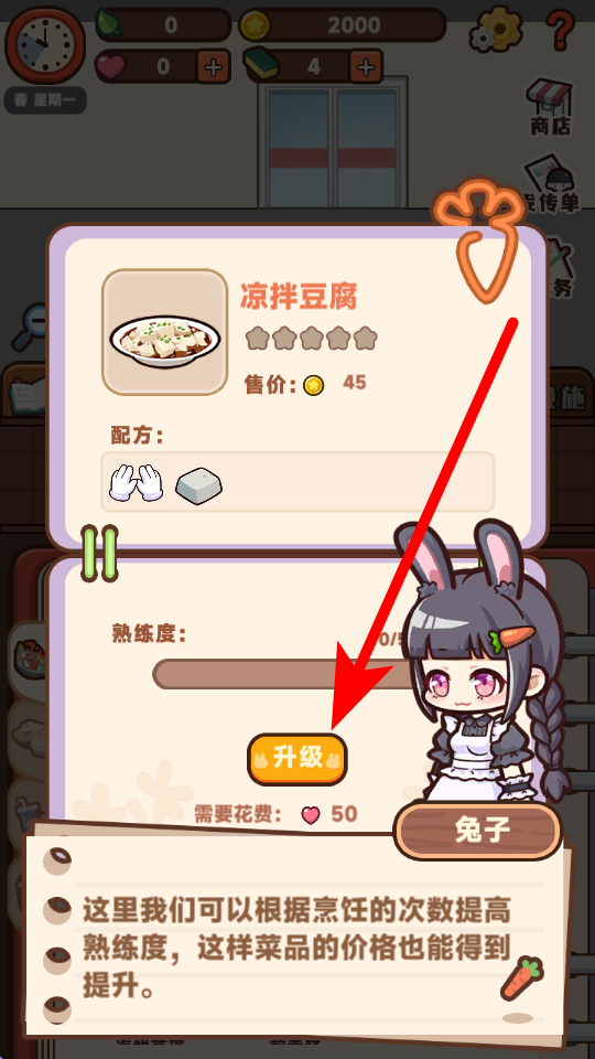 2、通過(guò)花費(fèi)愛(ài)心提升熟練度,隨著熟練度增加,菜品售價(jià)能得到提高,以此獲取更多收益。