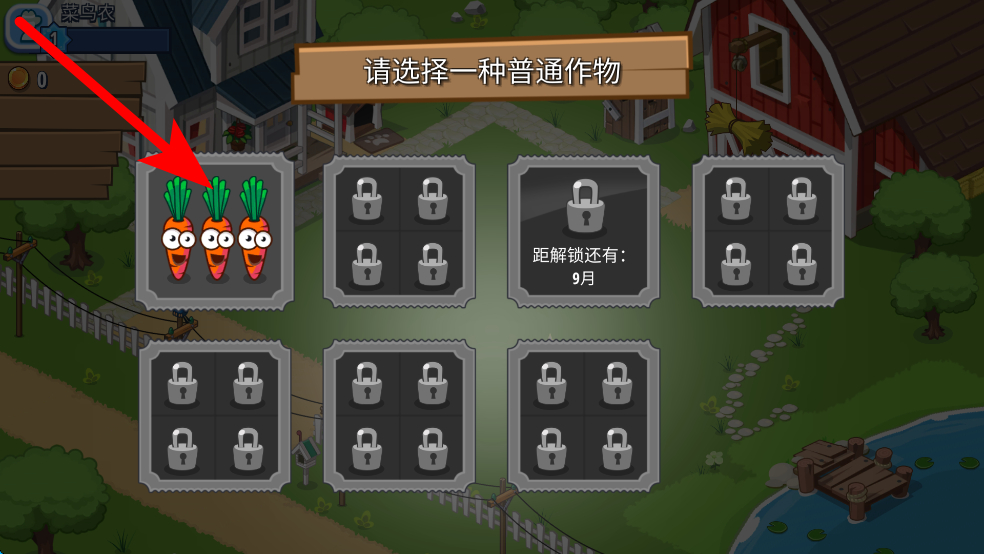 2、土地解鎖后,會(huì)出現(xiàn)選擇作物的界面,可挑選一種普通作物,比如胡蘿卜,選定后就能在土地上進(jìn)行種植,讓農(nóng)場(chǎng)有作物生長(zhǎng)。