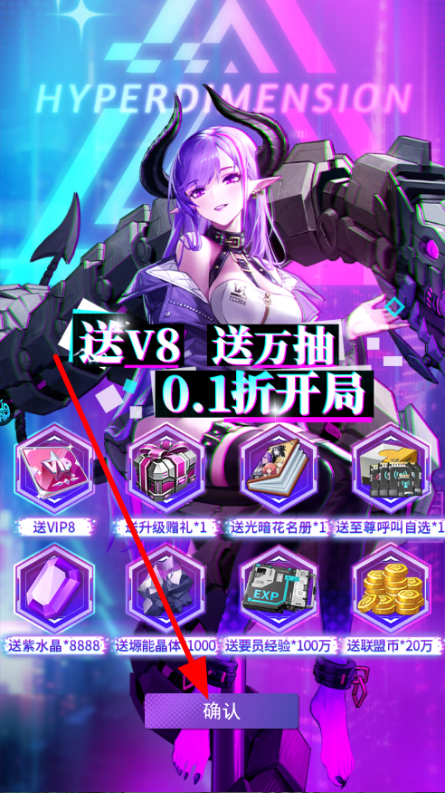 2、會有開局福利領(lǐng)取,像送VIP8、萬抽等,點擊確認(rèn),即可獲得這些福利,這些福利能為前期冒險提供助力,讓角色更快成長。