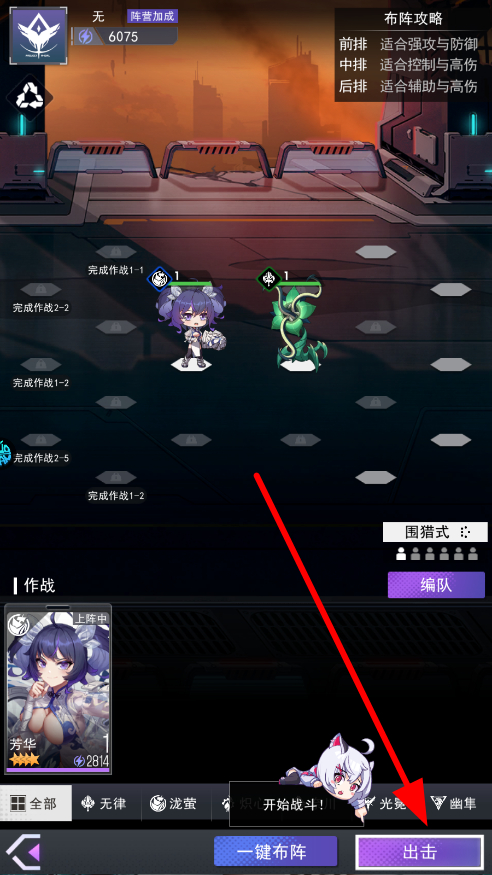 3、在作戰(zhàn)界面,可查看布陣攻略,了解不同位置的作用,然后點擊出擊,指揮角色投入戰(zhàn)斗,出擊與敵人展開對抗,推進冒險進程。