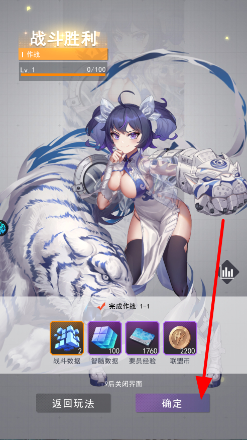 4、戰(zhàn)斗勝利后,會獲得戰(zhàn)斗數(shù)據(jù)、智腦數(shù)據(jù)、要員經(jīng)驗、聯(lián)盟幣等獎勵,點擊確定,即可領(lǐng)取這些獎勵,提升角色或解鎖新內(nèi)容等。