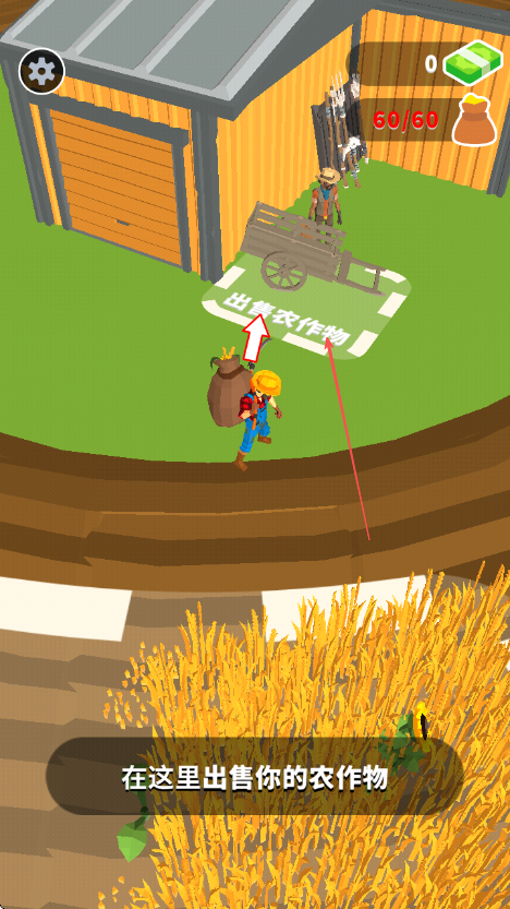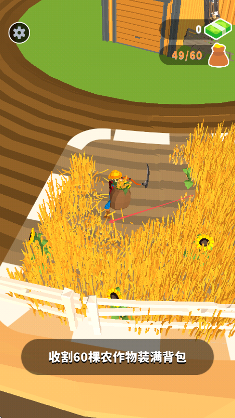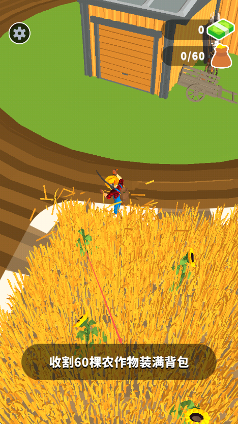 1、進(jìn)入游戲,操控角色走進(jìn)麥田,按照提示收割60棵農(nóng)作物裝滿背包開始收割。