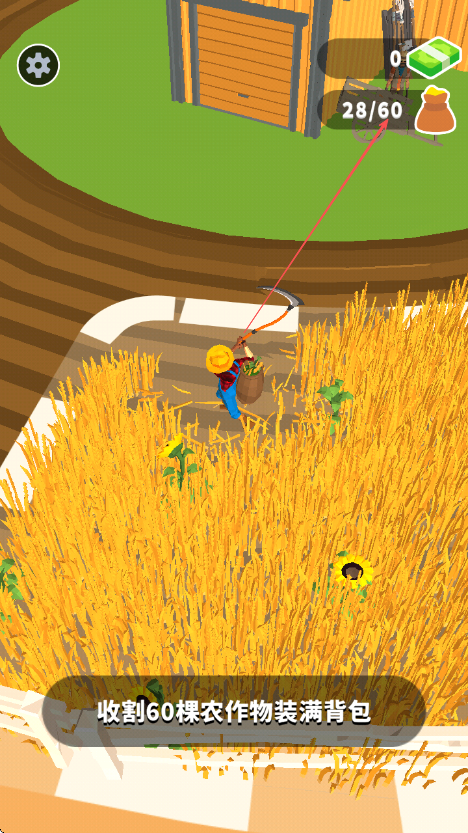 2、在麥田中移動,持續(xù)收割農(nóng)作物,留意屏幕右上方顯示的已收割數(shù)量如28/60。