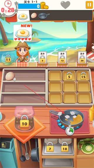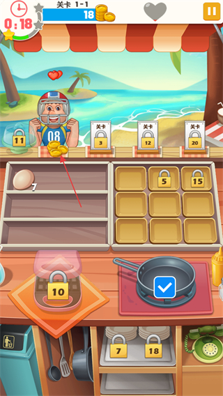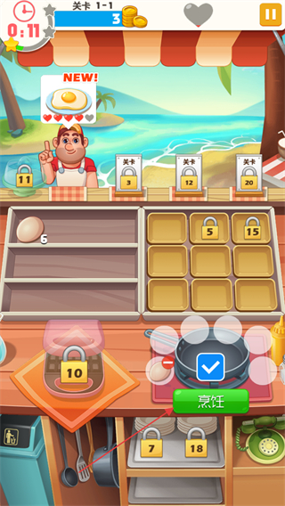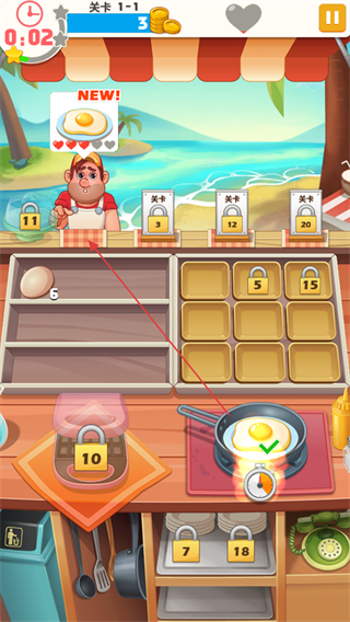 1、進(jìn)入游戲查看關(guān)卡1-1,留意上方顧客需求,如NEW!標(biāo)識(shí)的煎蛋,準(zhǔn)備所需食材如雞蛋。