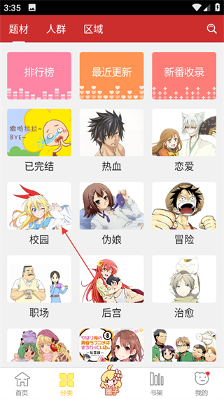 2、在分類頁面,選擇感興趣的并點(diǎn)擊,如校園題材分類。