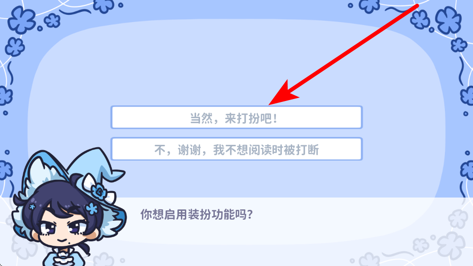1、首次進(jìn)入時(shí),在裝扮功能詢問界面,點(diǎn)擊當(dāng)然,來打扮吧,啟用裝扮功能。