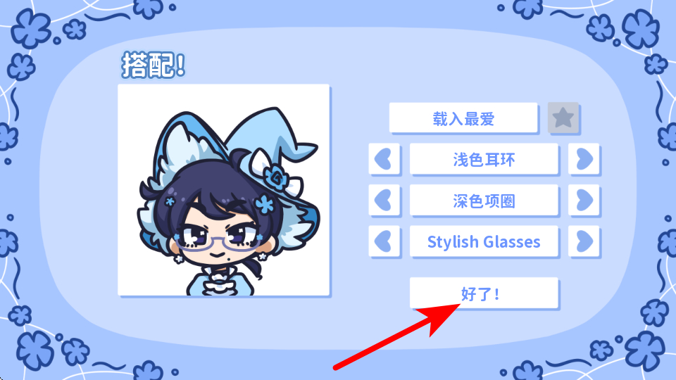 2、在裝扮搭配界面,完成飾品如淺色耳環(huán)等搭配后,點(diǎn)擊好了,確認(rèn)裝扮。