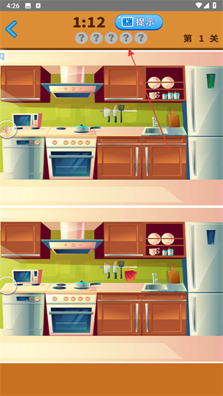 1、觀察廚房場景,對比上下圖差異,若找不到可點擊提示按鈕獲取線索。