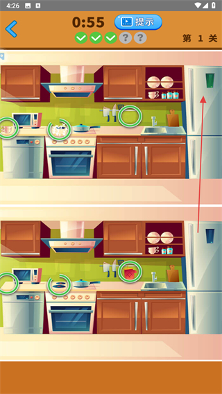 4、查看廚房右側冰箱,發(fā)現(xiàn)綠色部分的差異,點擊標記完成找茬。