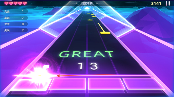 4、持續(xù)點(diǎn)擊音符,保持節(jié)奏,盡量減少失誤次數(shù),完成整首歌曲演奏獲取最終分?jǐn)?shù)。
