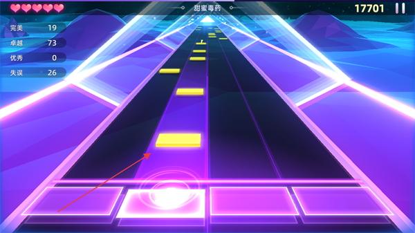 2、游戲開(kāi)始,跟隨音樂(lè)節(jié)奏,當(dāng)黃色音符到達(dá)下方指定區(qū)域時(shí),點(diǎn)擊對(duì)應(yīng)區(qū)域觸發(fā)按鍵。